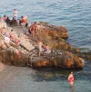 It works like this. You don the swimmers and your beach cover-up item, walk around the harbour until you find a space you like the look of. You squeeze your feet into reef shoes because you are going to enter the sea via rocks, many of which are covered in slime. This is when you discover the lack of Pilates classes really counts – my balance is appalling. However, once in the very salty water, all you need to do is float. No exertion required. The only sound is “ahhhh” as your body drops below melting point. One clambers out, rests, re-enters the water for another round of “ahhhh”, and re-packs everything for walk home. Shower and out to aperitivo and dinner.
