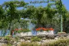 Lunch was under a pergola at a roadside restaurant, tables well apart, and no menu. Printed menus are thought to be a Covid risk, so the waiter gives you a verbal menu. Patricia and I both wondered why they didn’t use a blackboard, or a large menu pinned to a convenient wall.